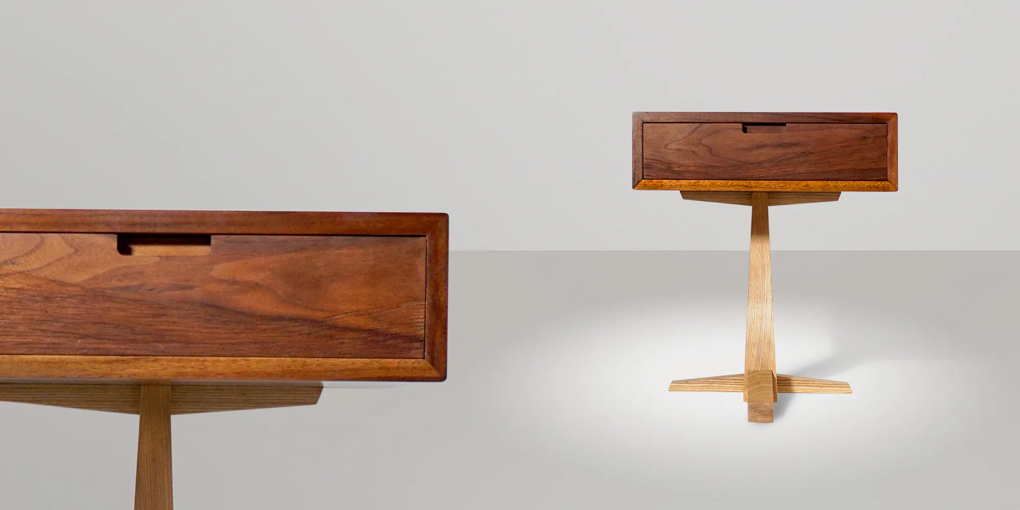 The Nightstands are handcrafted pieces that balance precision, warmth, and sculptural form. Each features a walnut drawer on a curved ash base, uniting strength and elegance through contrast in tone and grain. Built by hand, the design explores proportion, joinery, and material honesty. Influenced by modern minimalism, Japanese craftsmanship, the design distills form to its essence while celebrating natural beauty and tactile simplicity.