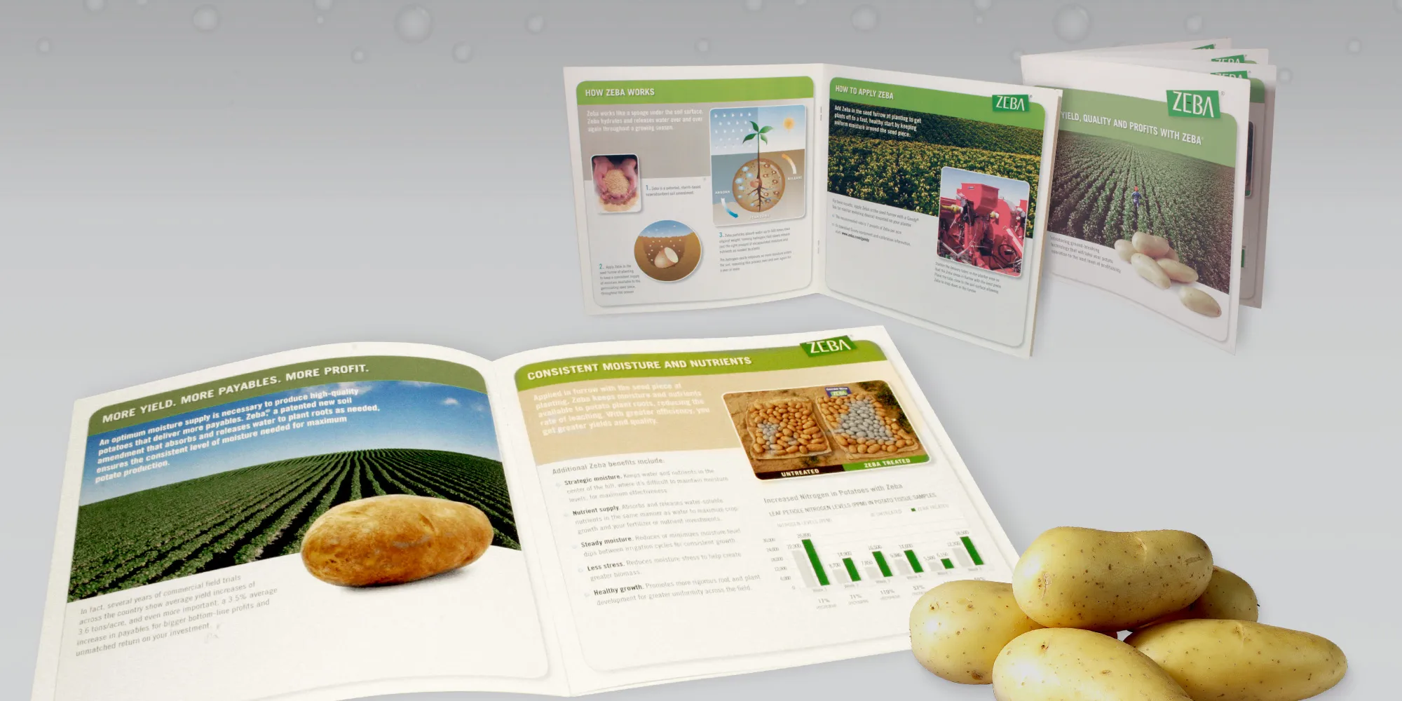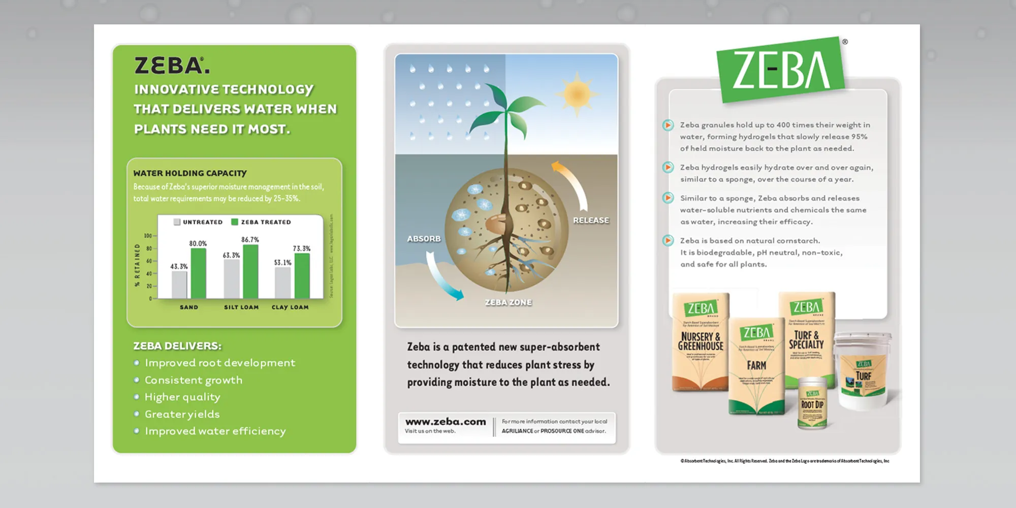 ZEBA creates starch-based water-absorbing products that enhance soil moisture and plant growth. The brand system was developed to convey innovation, sustainability, and scientific precision through cohesive packaging, web design, and product communication. Visuals simplify complex technology and present ZEBA as a global leader in efficient, eco-friendly agriculture.